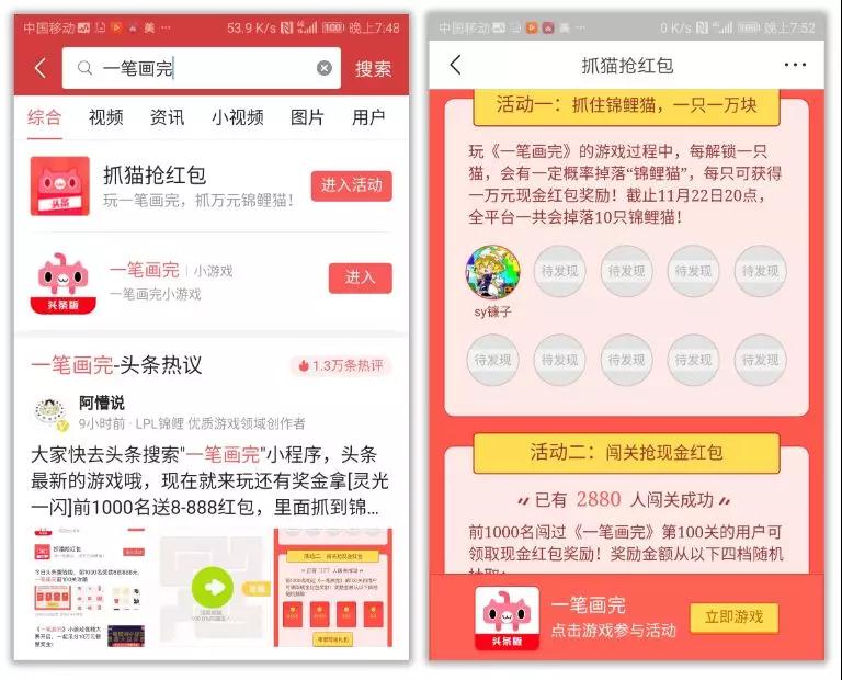 頭條小程序運(yùn)營(yíng)起來更“好玩”。近期,今日頭條推出“抓貓搶紅包”活動(dòng)。一方面,活動(dòng)頁(yè)面打通「一筆畫完」小游戲,促使用戶留存于游戲中。另一方面,頭條號(hào)激勵(lì)創(chuàng)作者產(chǎn)出「一筆畫完」相關(guān)的視頻內(nèi)容,打造超級(jí)話題。