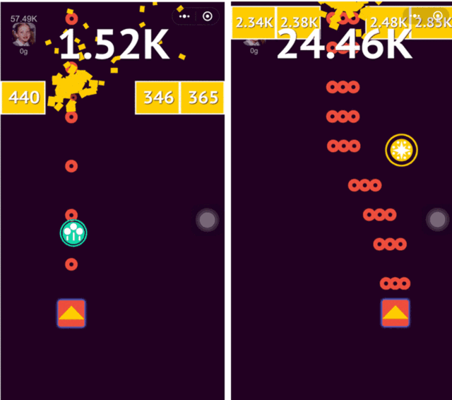 ? ? 在一局游戲中,這些磚塊上的數(shù)字會隨著游戲時(shí)間的延長而增大,所以最初低速、低頻的子彈,顯然無法滿足后期驟增的攻擊需求。這個(gè)時(shí)候,你需要「吃道具」。
