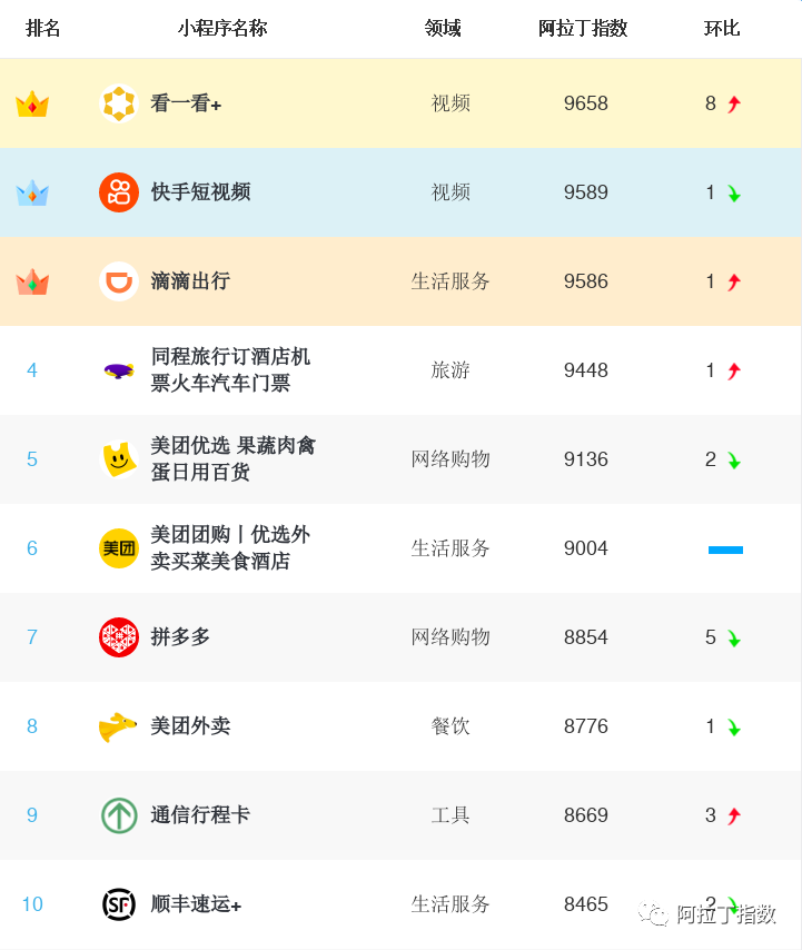 由阿拉丁研究院出品的全網(wǎng)微信小程序榜單新鮮出爐,最新看點就是在TOP10榜單中看一看+小程序登頂榜首,而長期占據(jù)前三甲的拼多多小程序本月僅排名第7,一起來看看吧!