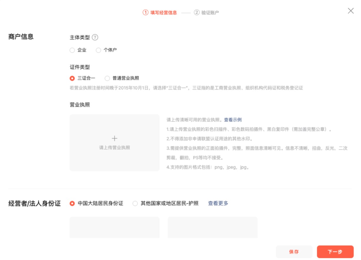 3、選擇賬號(hào)類型(目前只支持企業(yè)/個(gè)體商戶,個(gè)人暫未開放),點(diǎn)擊下一步;