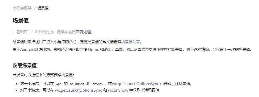微信小程序場景值在基礎(chǔ)庫1.1.0開始支持,如果是低版本需要做兼容處理。另外,由于Android系統(tǒng)限制,目前還無法獲取到按 Home 鍵退出到桌面,然后從桌面再次進(jìn)小程序的場景值,對于這種情況,會保留上一次的場景值。