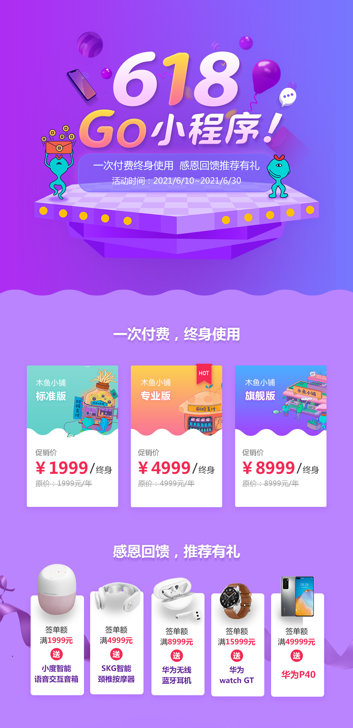 在活動期間購買木魚小鋪商城小程序任意版本套餐,即可參與新人專享活動。制作木魚小鋪任意版本小程序均可享受一次付費終身使用特惠活動,同時獲得價值980元的小程序店鋪裝修大禮包一份。