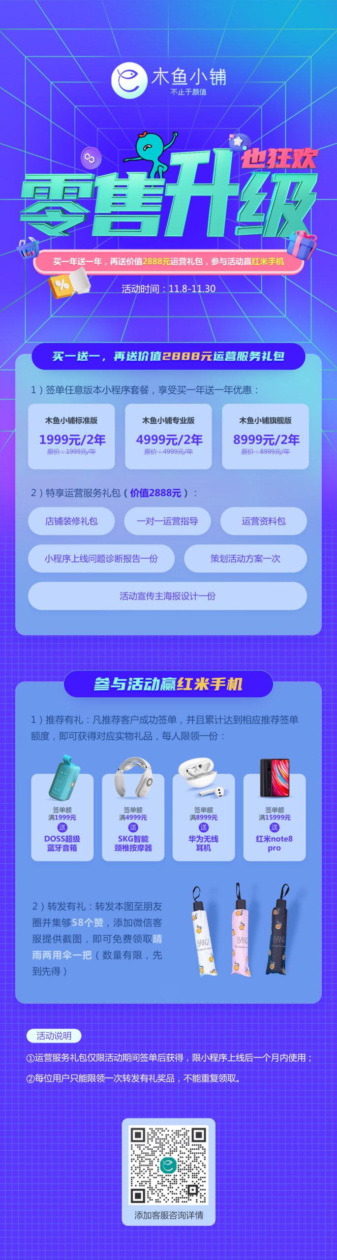 本次雙十一木魚小鋪還推出推薦轉(zhuǎn)發(fā)有禮得實物禮品活動,既是回饋我們的新老客戶,也是讓更多的實體企業(yè)商家看到并意識到零售商城小程序在數(shù)字化轉(zhuǎn)型過程中的重要作用。