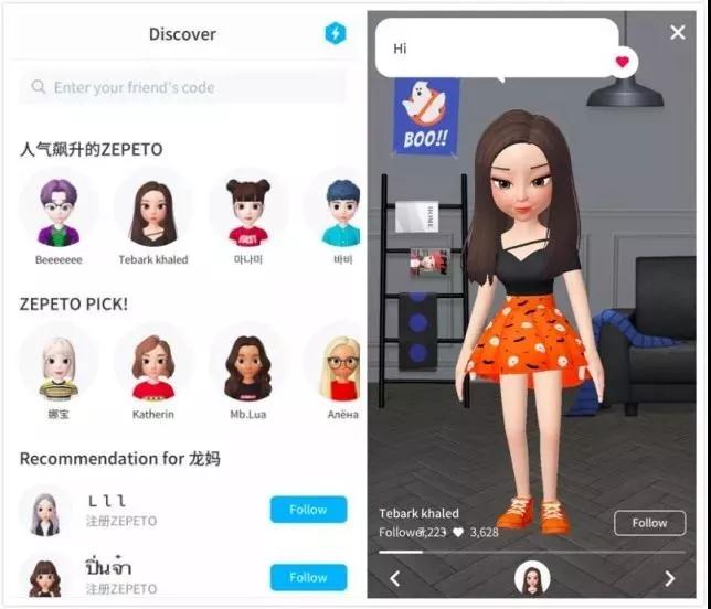 最后是陌生人推薦。在「發(fā)現(xiàn)」頁面,你會看到「人氣飆升」、「ZEPETO PICK」以及「為你推薦」,這是ZEPETO為你推薦的玩家,你可以選擇進入對方頁面,然后根據(jù)對方的形象、裝扮、空間環(huán)境等判斷對方的洗好和品位,進而決定是否要產(chǎn)生如關注、聊天等社交行為,而這也恰恰被眾多媒體解讀為ZEPETO試水陌生人社交的動作。